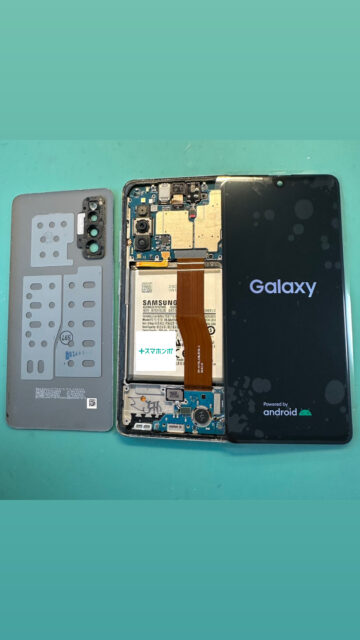 スマホンポのカウンターに持ち込まれるGALAXYa41。画面にひびが入っていても、一台一台にお客様の大切な物語がある📱